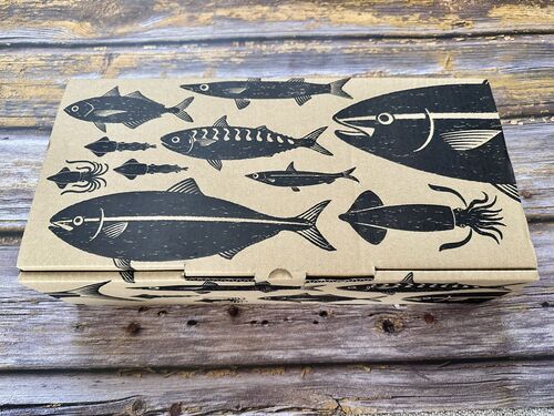 届いた外箱はクラフト紙色に黒い魚のイラストがたくさん描かれた、温かみのあるデザイン。 箱を開ける瞬間からワクワクして、富山の海の香りがふっと頭に浮かびました。 ひとつひとつ丁寧に包まれていて、すべてを並べてみると……圧巻。富山湾の豊かさそのも…